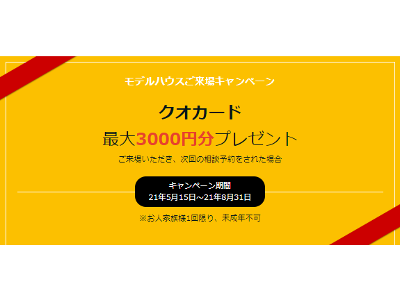 新モデルハウスでは、ご来場いただいたお客様で、次のご来場予約をいただきますと、なんと太っ腹の3,000円分のQUOカードをプレゼント!