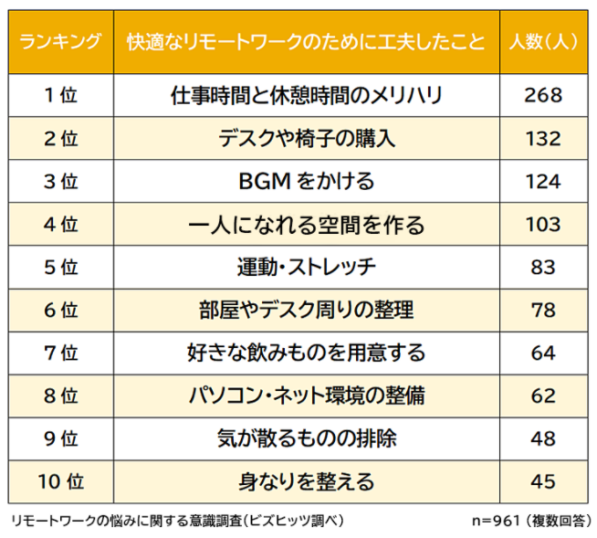 引用元:Biz Hits「快適なリモートワークのために工夫したこと」より