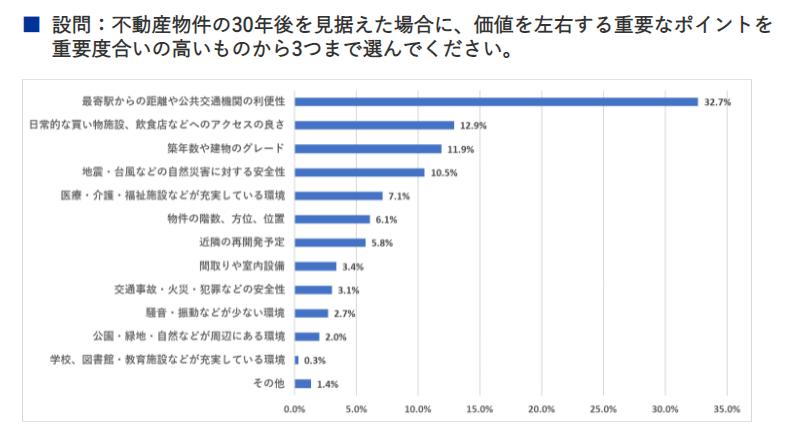 また30年後も価値が下がりにくいポイントとしては、公共交通機関へのアクセス性やお買い物施設や飲食店が近いなどの利便性を重視しているよう。
