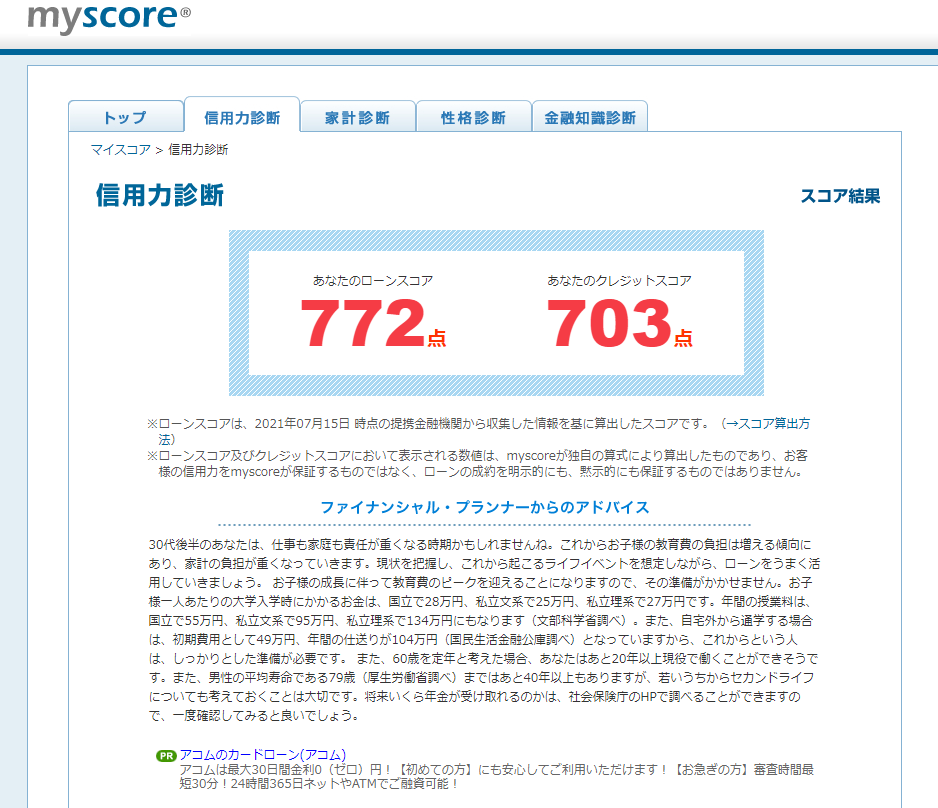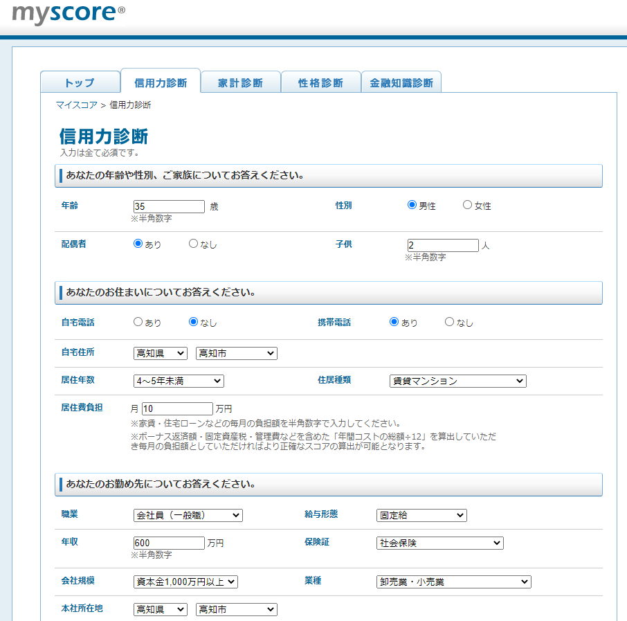 SBIホールディングスが運営する「myscore」は、無料ですぐに今のあなたの信用力を診断できますよ。