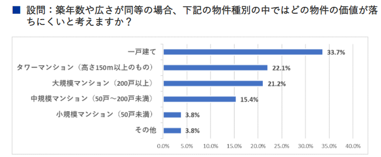 SBIエステートファイナンスで2019年に不動産会社の関係者などを対象に行われた、「30年後に価値が下がらない物件について焦点を当てたアンケート調査」にて以下のような結果が出ています。