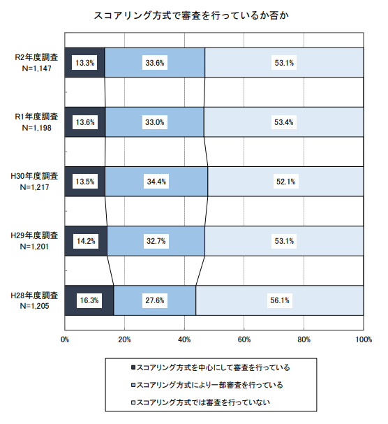る」(33.6%)または「スコアリング方式を中心にして審査を行っている」(13.3%)と回答した金融機関が全体の4割を超えています。
